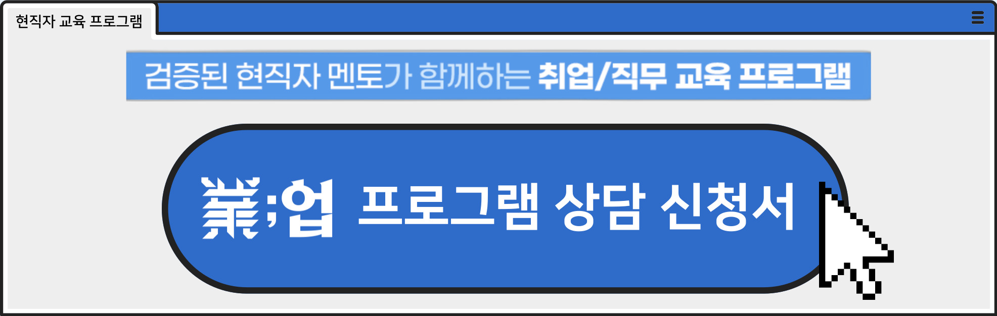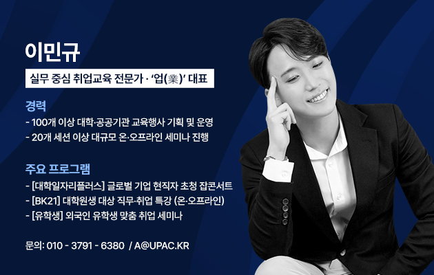 [추가 제안 프로그램] 업(業)은 실무 중심 커리어 교육 전문 브랜드입니다. 학생 중심, 결과물 중심으로 설계된 실전 교육을 제공하며, 전국 공공기관, 대학과 함께 성장하고 있습니다. 다년간 경험으로 학생의 실제 수요에 맞는 대기업 / 해외 현직 멘토와의 직무 특강, 피드백 및 Q&A 활동을 제공하고 있습니다. | ||